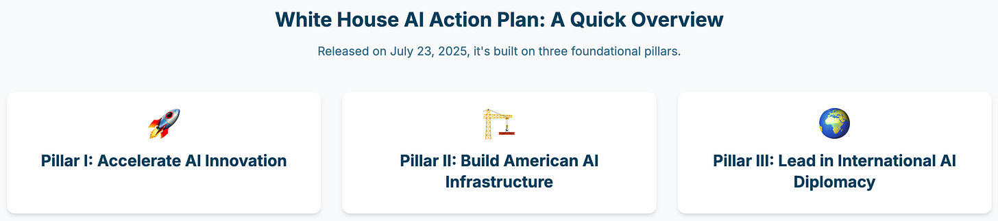 But first a quick recap of the twenty-three pages long America’s AI Action Plan. America’s AI Action Plan frames pursuit of AI leadership as a critical national security imperative. The nation that pioneers the AI frontier will set global standards, reaping profound economic and military advantages. This plan is a whole-of-government strategy for the United States to win this race.