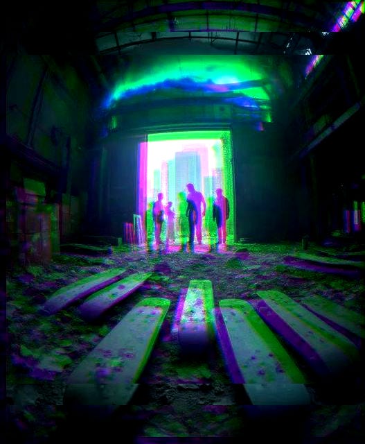 In the shadows of Tokyo's ruins, glowing portals appear beneath a vibrant aurora, radiating warmth and mystery, beckoning survivors with promises of connection and untapped power in a violently transformed world.