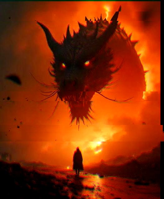 In this eerie scene, a fiery orange light engulfs the submerged ruins of Tokyo, creating an otherworldly atmosphere. A giant dragon looms before you, its cracked, melted skin trembling with rage under the gaze of blazing flames, its sharp claws poised to strike. It embodies the fear and despair of a city risen from ashes and darkness.