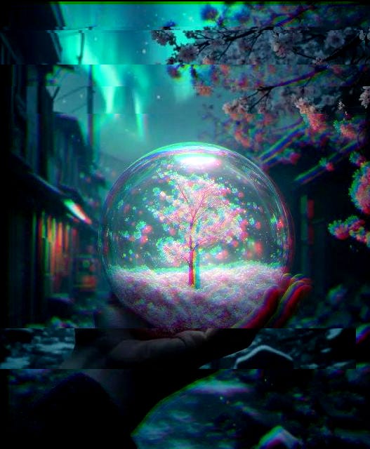 In the shadows of a ruined Tokyo, a delicate artifact takes shape: a transparent orb housing a cherry blossom that appears to shimmer with an ethereal glow as time passes, symbolizing both the fragility and resilience of life as spring breathes new hope into a recovering world.