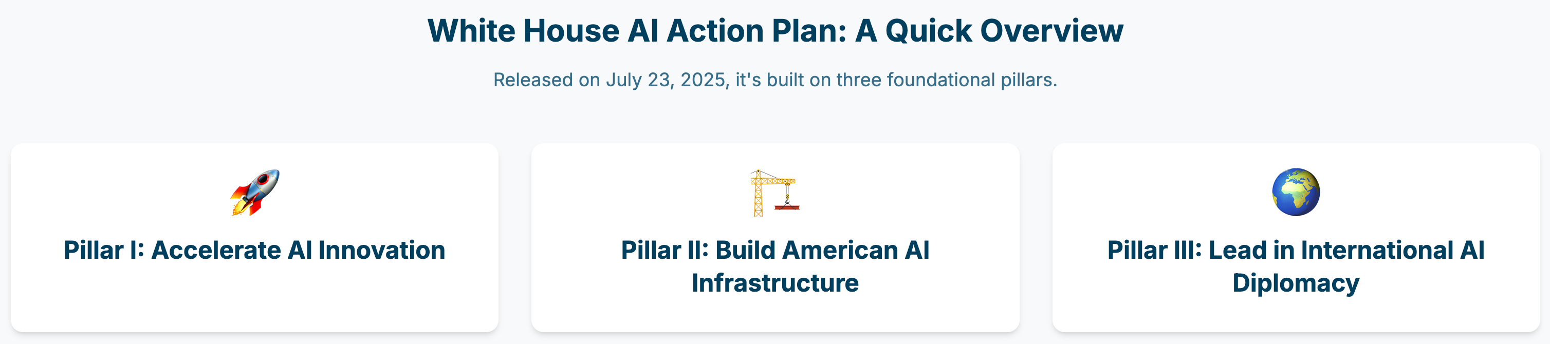 The AI Action Plan is a fairly comprehensive document that is worth taking the time to understand and unpack. To supplement this article I have created a visual summary of this article that includes a quick recaps of the key policy action points across the three pillars of the White House AI Action Plan that can be viewed at kairoses.com/#visualsummary